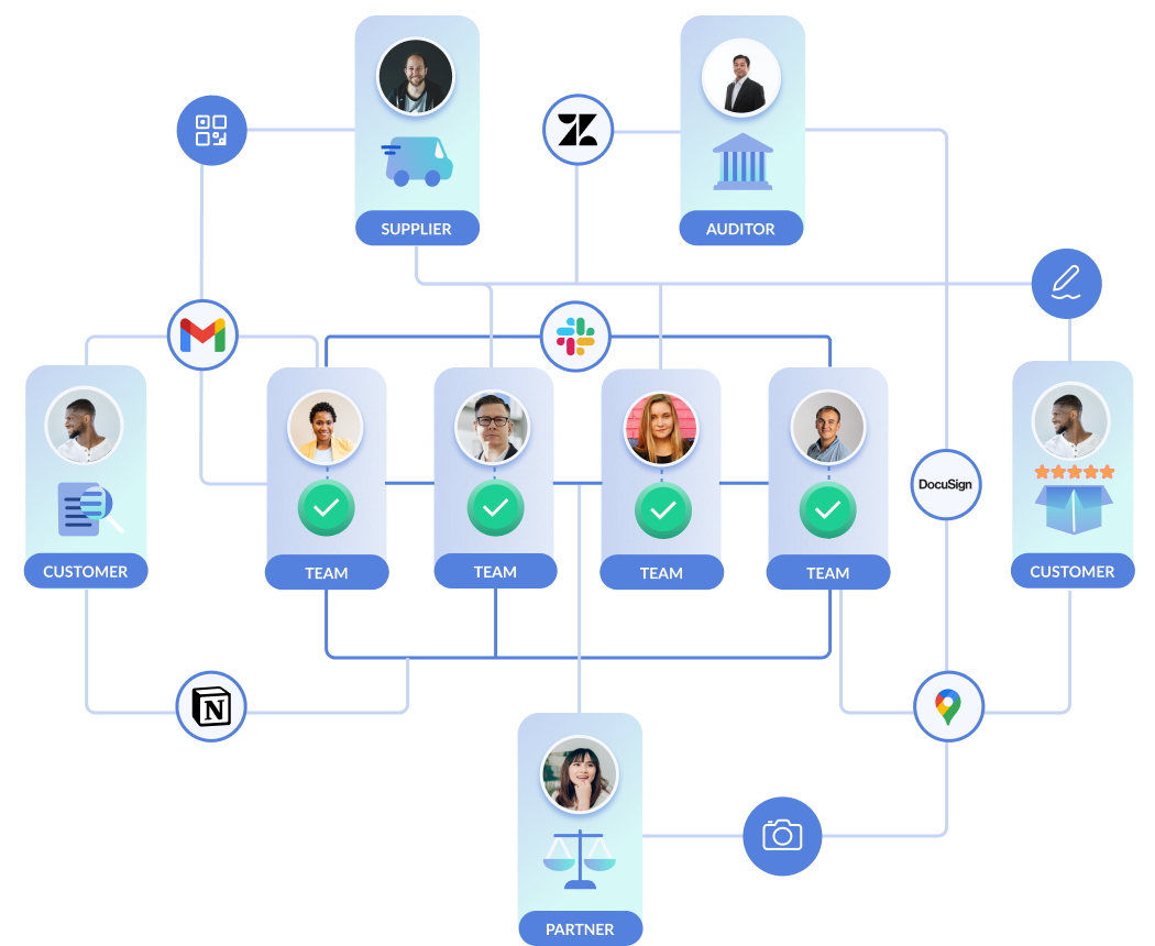 The best example of this is a product return process. After the return has been approved, the organization needs to provide the customer with a shipping label from an approved vendor â and they also need to co-ordinate the pick-up between customer and courier. The CS team, customer, and courier need to be updated at every stage of the process. And the productâs status and whereabouts need to be updated in the companyâs ERP.