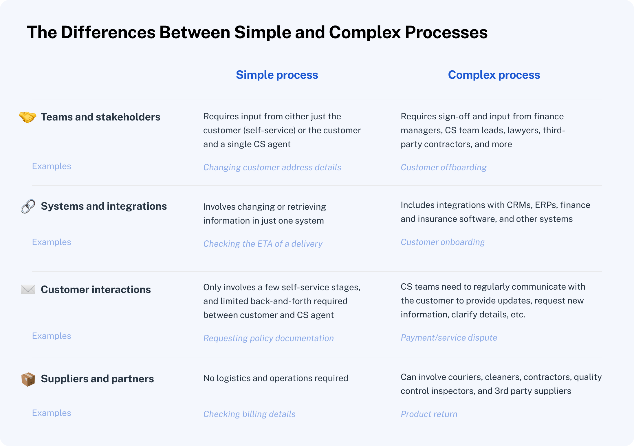 All three of these situations are examples of complex customer service tickets in action. Customer onboarding, product returns, and claims handling are uniquely complex processes, requiring multiple teams, stakeholders, and integrations. But what does that mean in practice?Â