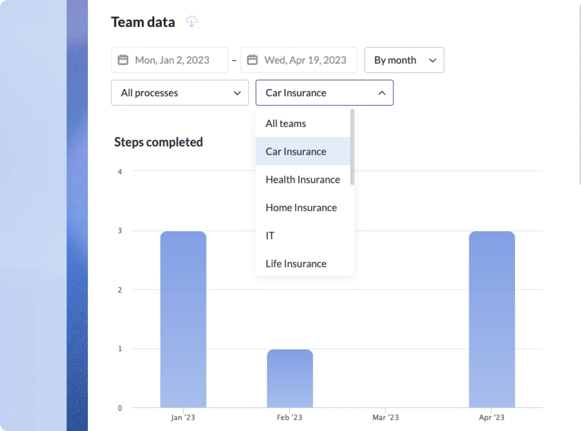 In addition to your ticketing system and manually tracked metrics, your workflow solution should offer performance analytics for your newly built workflows. That means, you should be able to track operational performance and throughput metrics over time, and look at things like workflow steps, process performance, and team performance.Â