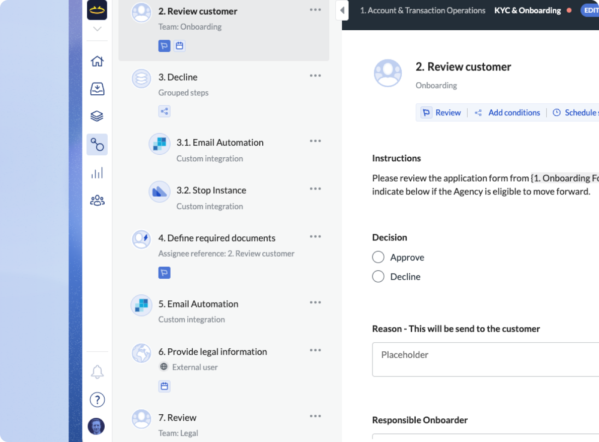 The problem with KYC-specific tooling, however, is that many solutions do not support integration with your full stack, and additionally, most do not include workflow automation as a means of threading together multi-step and multi-stakeholder processes – for example, KYC one part of a comprehensive customer onboarding process. For that reason, we recommend looking into workflow and process automation solutions, with KYC function-specific automation tools integrated where required.