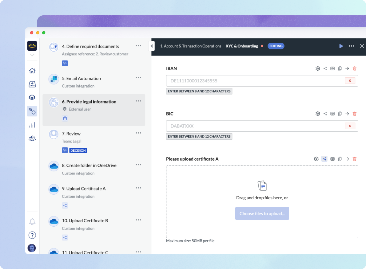 Workflow automation allows banks to build seamless experiences for collecting required KYC data points. This can be achieved via web experience, on mobile devices, or using integrated services like chatbots.Â