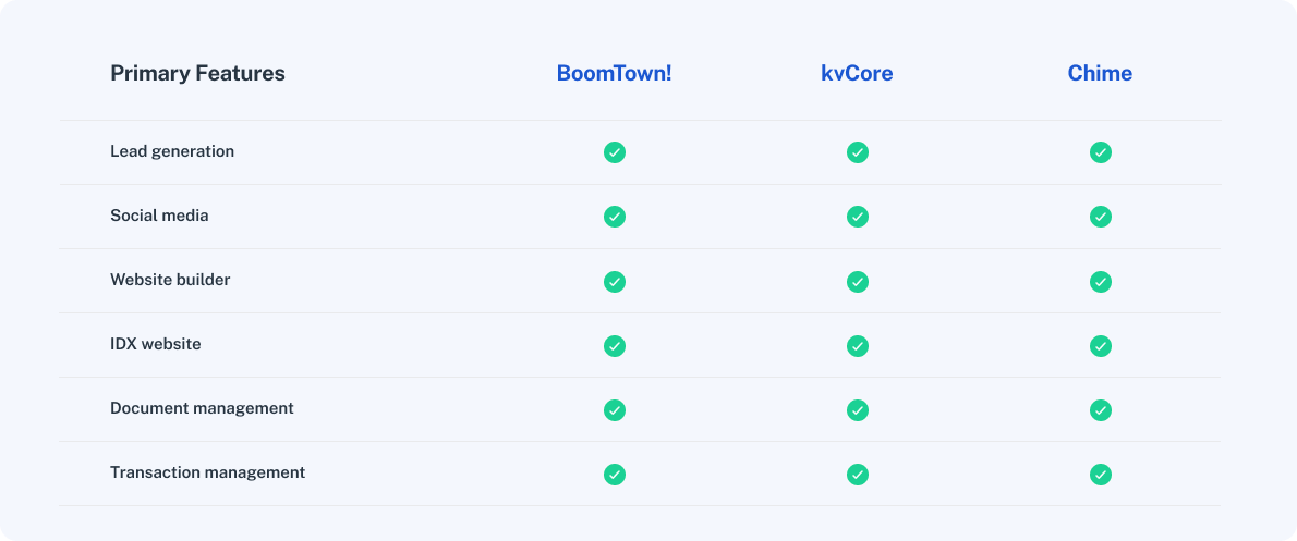 Here's a look at three examples of real estate CRM software:Â BoomTown!, kvCore, and Chime: