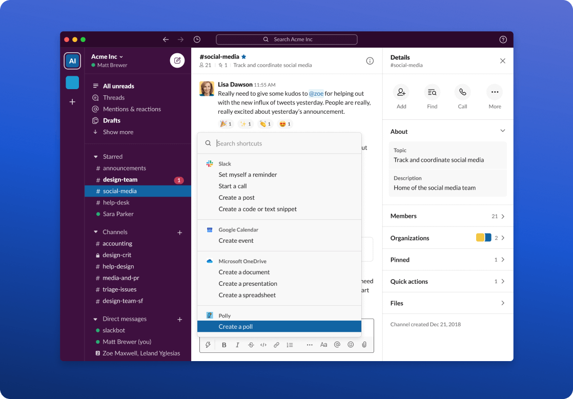This can be a focus game-changer, and will cut down on time wasted reading through unnecessary CC:'s/BCC:'s. Slack also includes loads of integrations which can prevent unnecessary application switching for executing basic business functions.