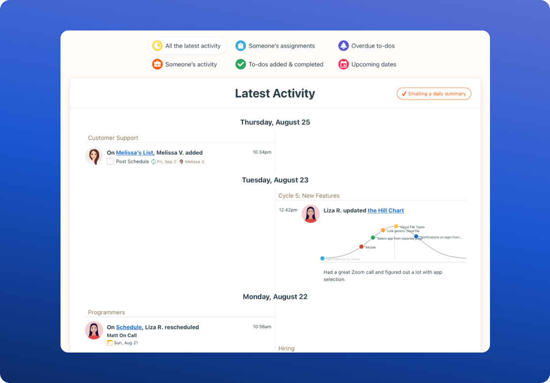 Every project in Basecamp includes 6 specific tools teams need to get the project finished: a message board, to-do list, real-time chat, the schedule, docs & files, and an automatic "check-in" to get a pulse on daily progress.