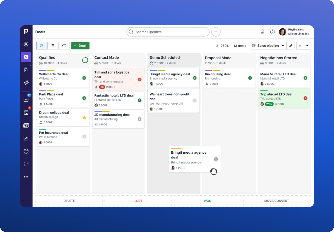 Pipedrive actually got its start by helping growth-stage companies scale up sales. They intentionally focused their product experience on first-time, non-technical users. Setting up accounts and onboarding is a breeze.