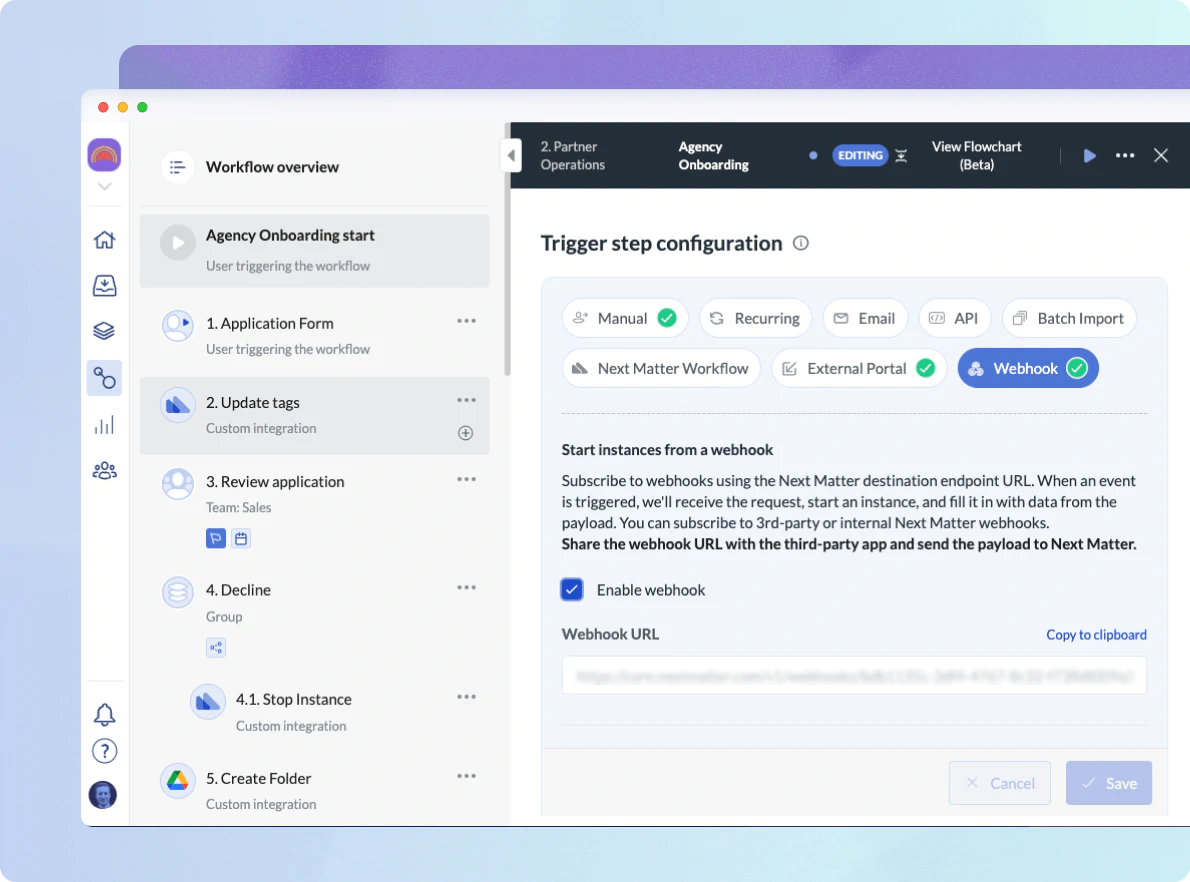 Event triggering is now as easy as pasting a URL and testing that it works. You can use webhooks triggers to start workflow instances automatically when an event occurs on a different platform.