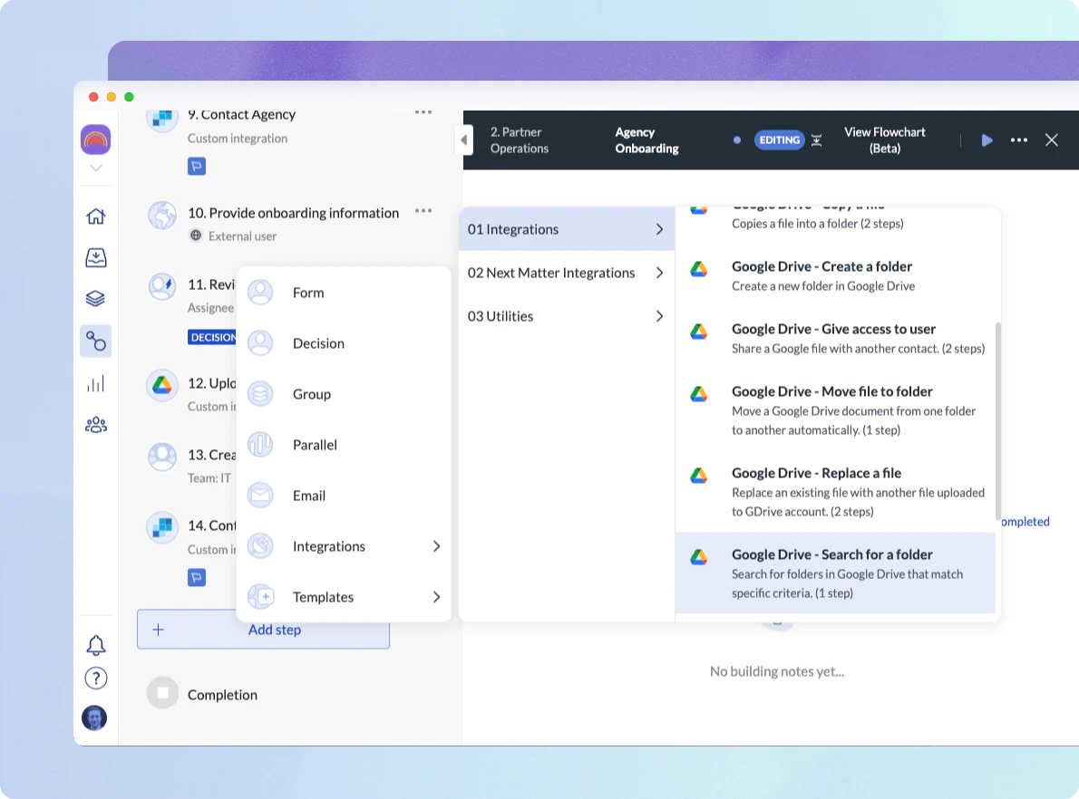 We’ve added more flexibility and options to our Google Drive Steps, allowing the user to search and select which Drive Folder to send files to, or select files from. This step is one of several Google Drive Step Templates available in Next Matter.