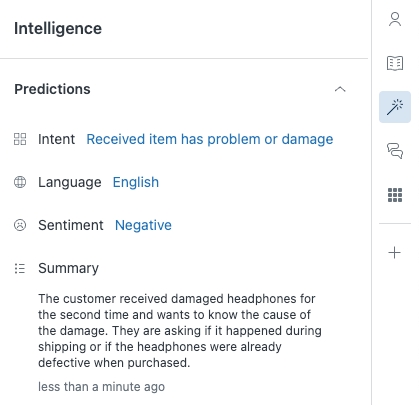 - Intelligence in the context panel uses Generative AI to summarize key information about the ticket, including the user intent, language, and sentiment. It’s an extension of the ‘knowledge’ feature we discussed in the last section.