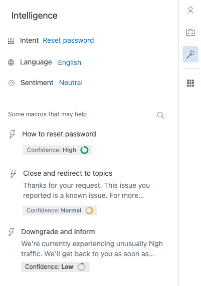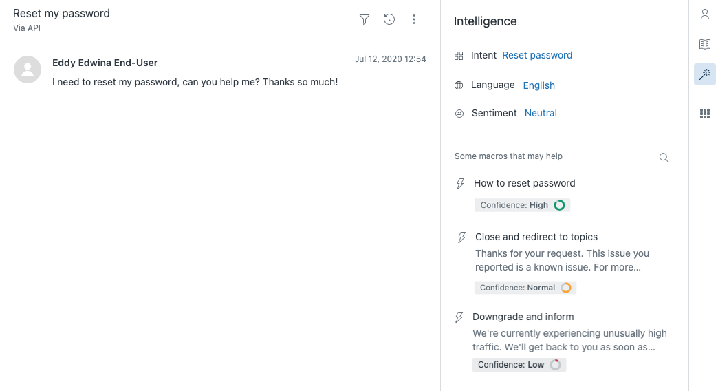 This allows agents to quickly glance over and understand the basic details of a ticket before reading the full communication. It also suggests relevant macros to apply such as ‘reset password’.
