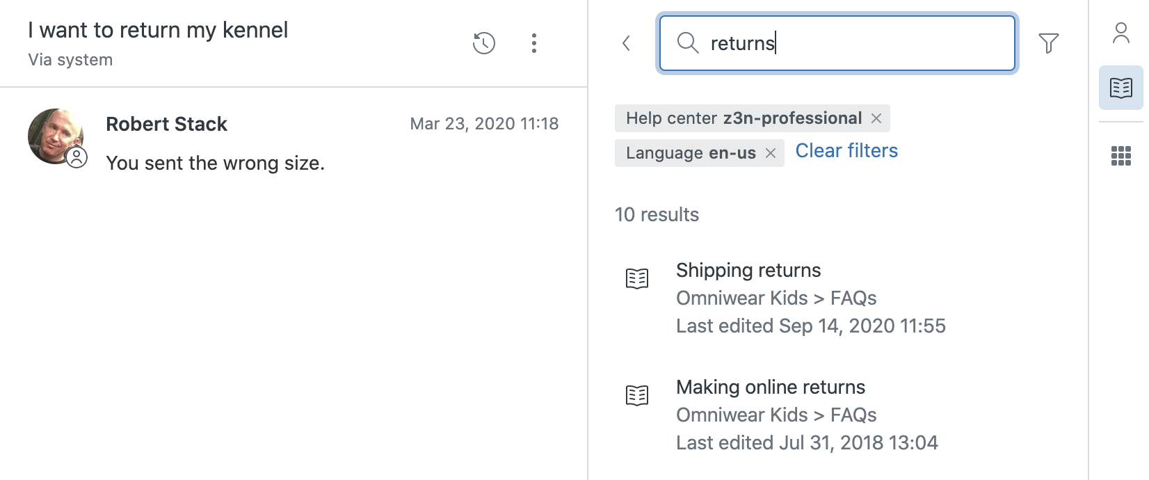 - Knowledge in the context panel lets agents easily search through the knowledge base and community forums from within the helpdesk product. By entering keywords like ‘refunds’, they can quickly access the relevant knowledge base article from the existing context panel. This makes it quicker for agents to get the information they need without switching apps or windows.