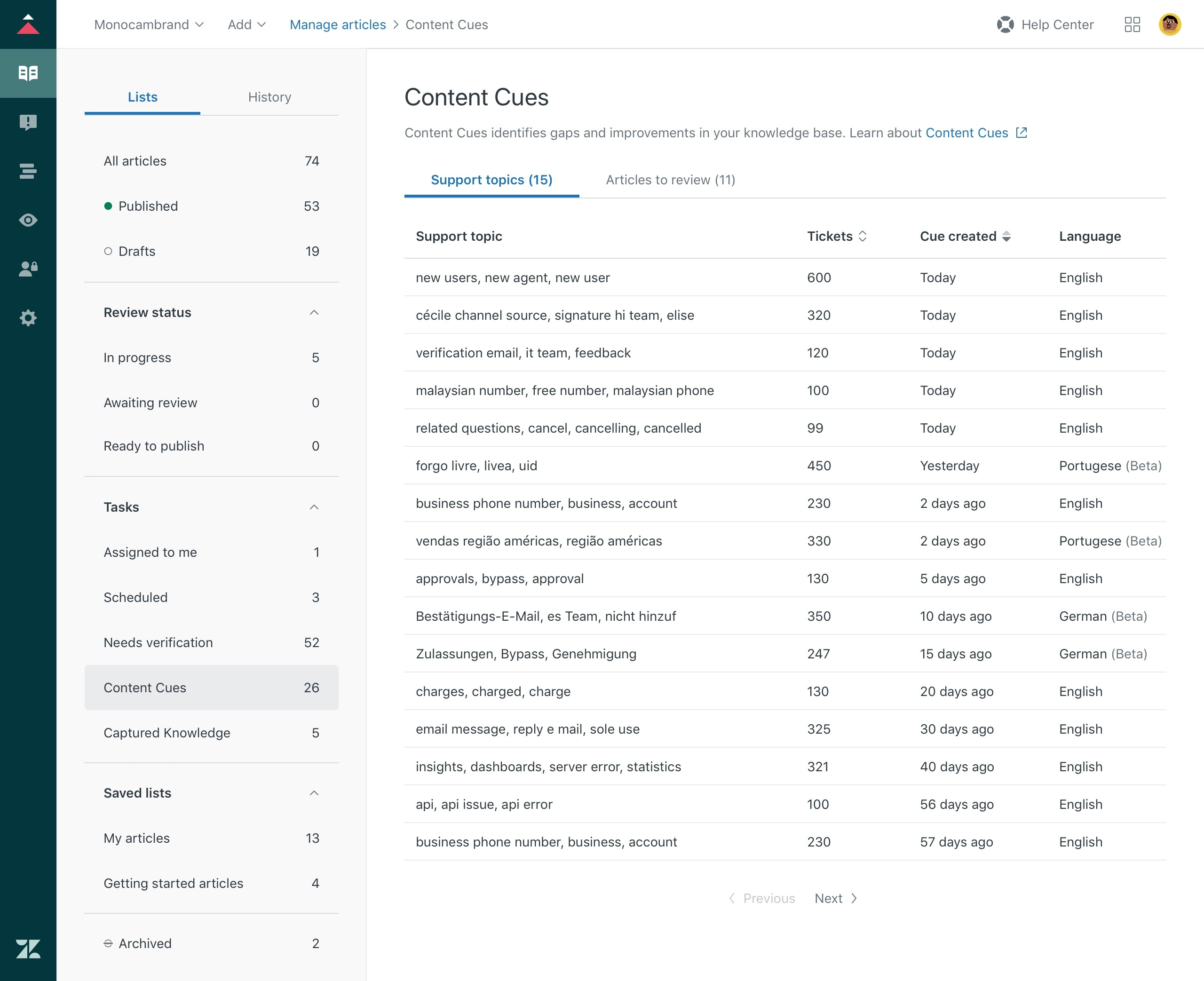 - Content cues help admins improve their customer-facing knowledge bases and FAQ pages. Using machine learning, the feature analyzes the content of incoming customer correspondences and suggests the best articles to create based on the combined insights from all of them.