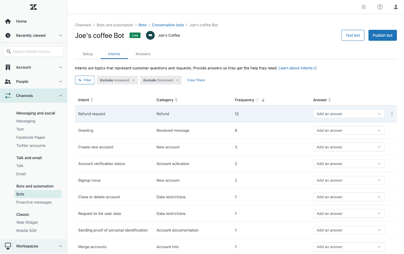 🔧 How to use it: Intents can be viewed from within the ‘bots’ section in the Admin Center. It includes information on intent, category, frequency, and existing relevant answers.