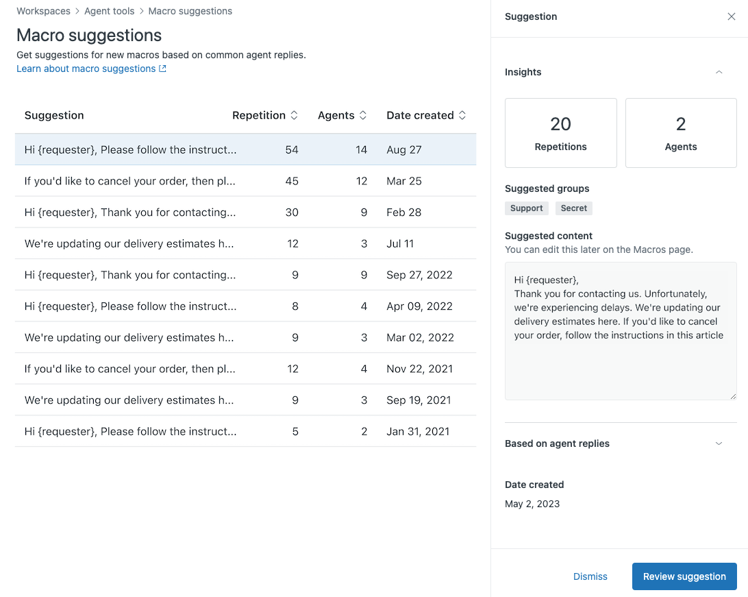 - Macro suggestions help identify which processes would most benefit from new macro-based automations. These suggestions are made to admins based on sentiment analysis of customer communications and the overall context of tickets. For instance, if customers are regularly asking to check order details, this feature would suggest a macro to help agents quickly retrieve order information.